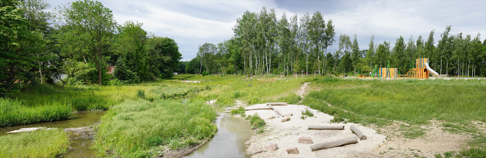 Das Bild der zwei sich verwebenden Landschaftselemente Bahntrasse und Bachlandschaft wird weiterentwickelt, so entsteht der neue Grünzug Pleißenbach mit ca. 9,6 ha Fläche.